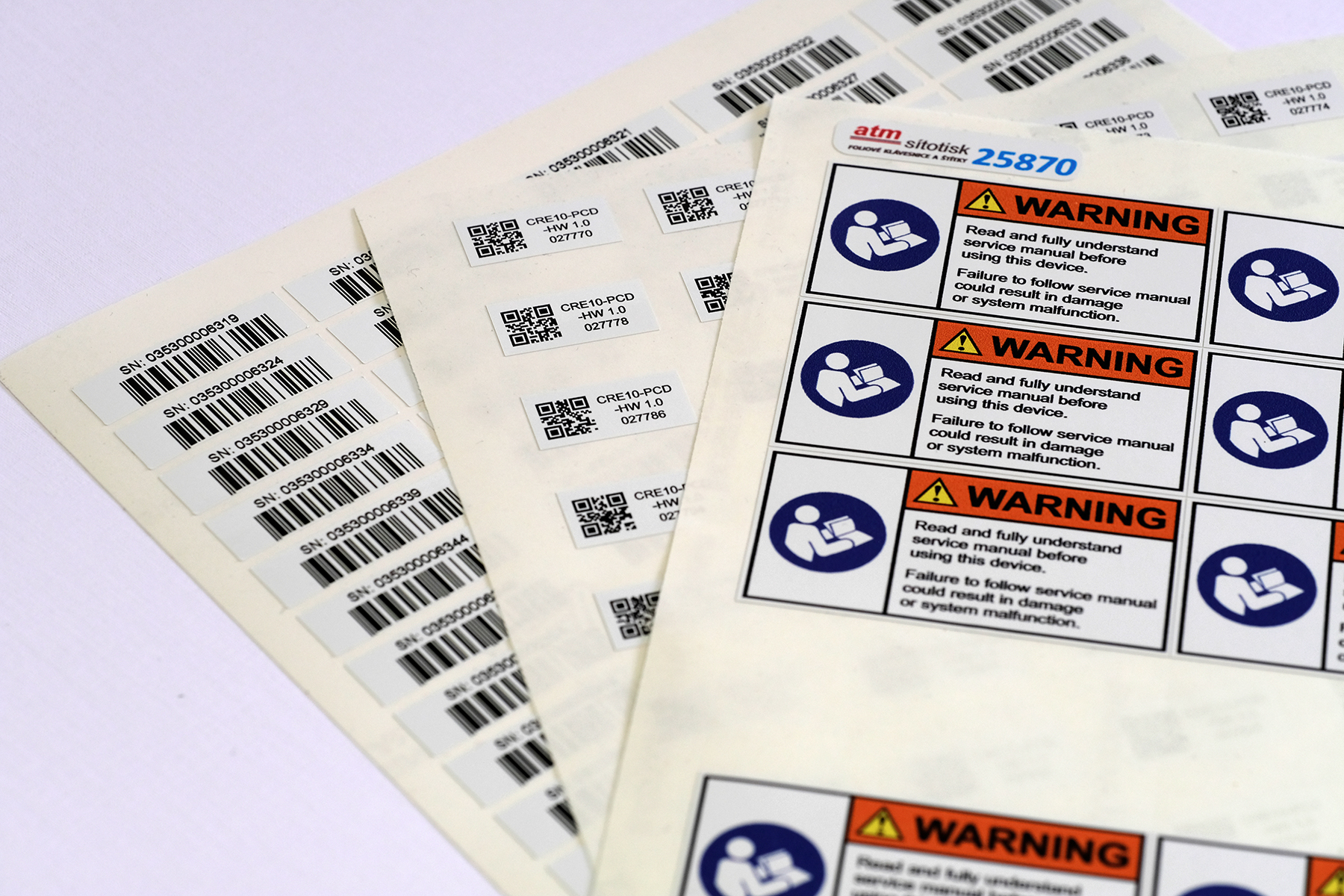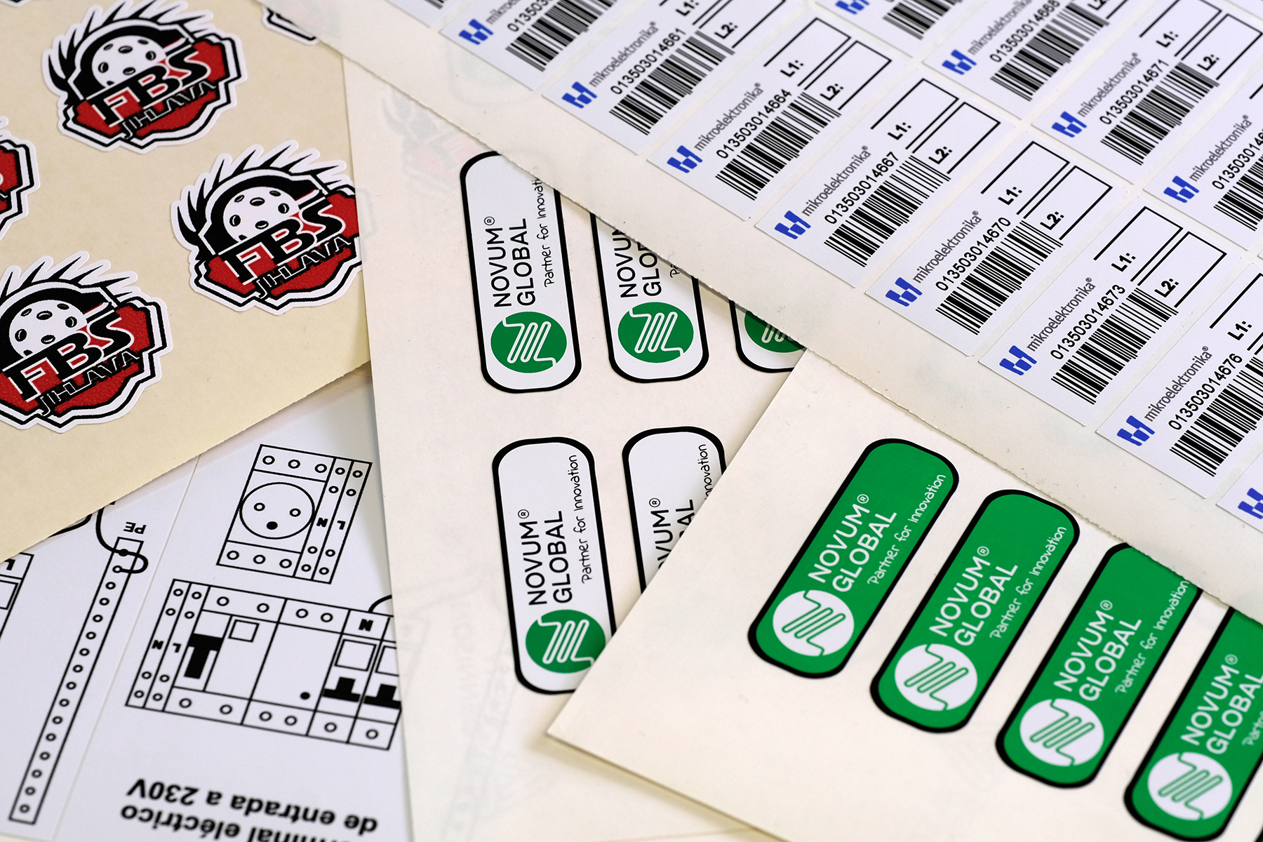 Samolepící štítky jsou určeny převážně pro označování výrobků, informační systémy a reklamní účely. Použitý materiál je dle barevné škály výrobců samolepících folií a samolepících papírů.