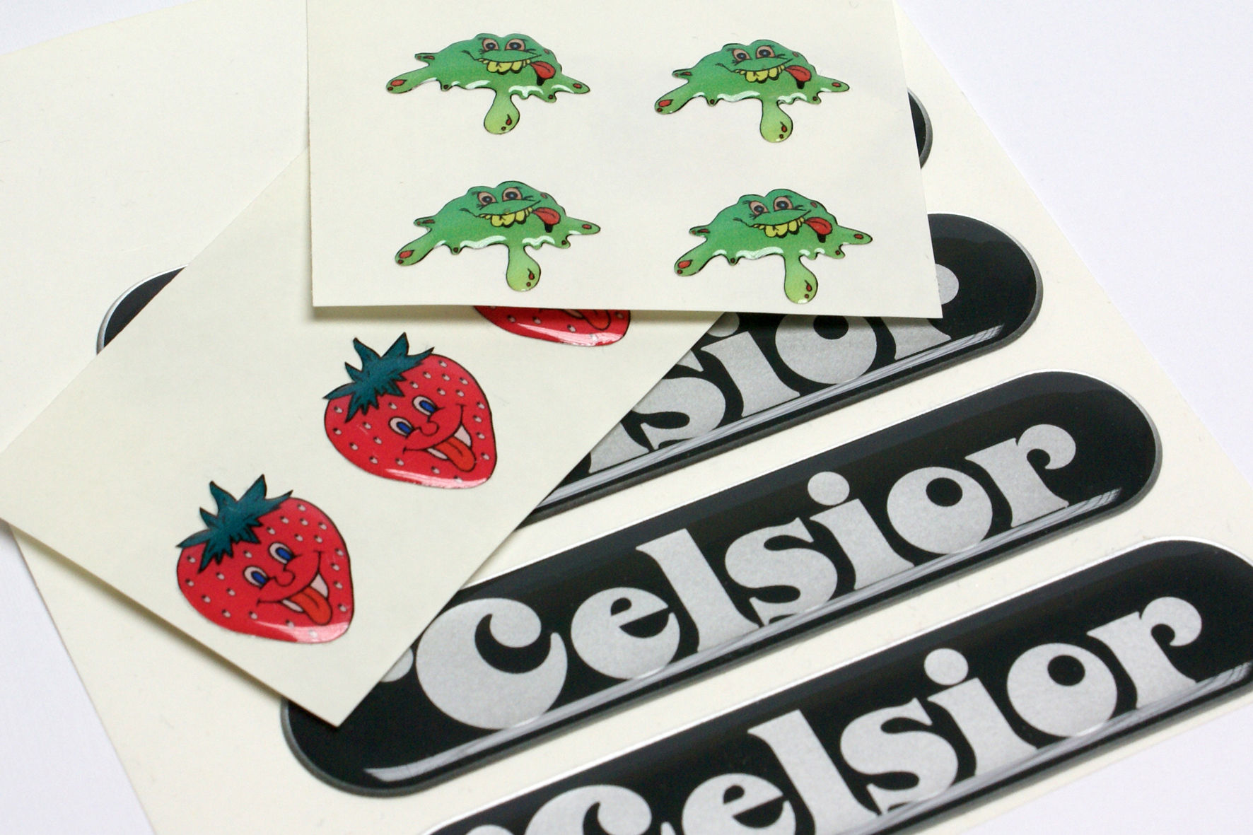 Tištěný motiv je na vrchní straně folie ( papíru ) v barvách dle výběru - vzorníky RAL, Pantone a další. Samolepky jsou vyráběny ze samolepících folií polyesterových, PVC, hliníkových, acetátových a papírových. Štítky PVC pečetní nelze bez mechanického poškození odlepit. U těchto štítků je pevnost lepidla vyšší. Pro reklamní označení výrobků jsou používány tzv. logotypy – štítky zalité do pryskyřice ( poloplasty ). Tyto štítky vynikají nejen svým estetickým vzhledem, ale i svou mechanickou a chemickou odolností.